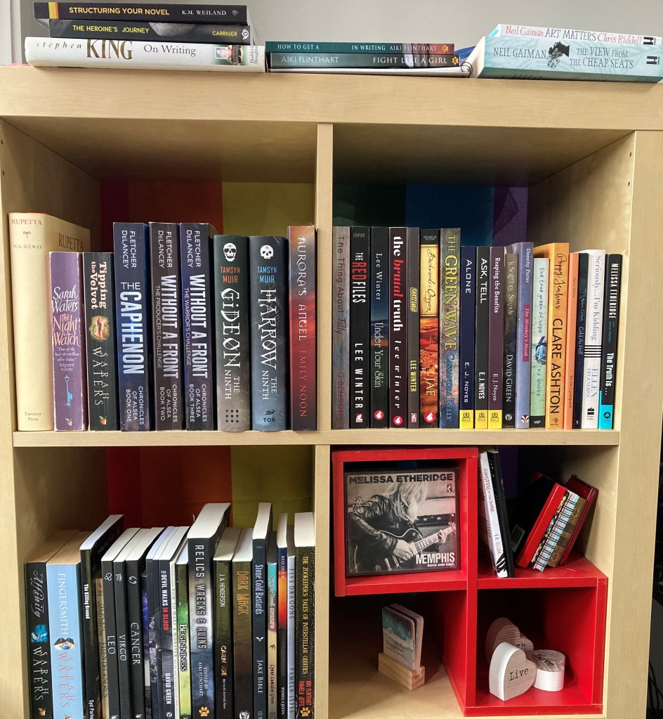 The growing beauty of my office/Sapphic/Indie bookshelf (several more shelves are scattered and filled elsewhere throughout the house).